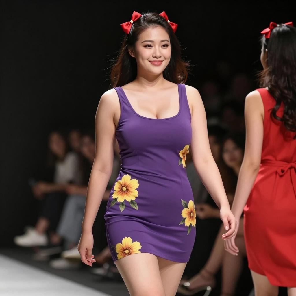 Asian woman with large breasts and thick thighs in a tight purple dress with yellow floral patterns. Red hair bows on her head. Standing on a runway, smiling. Black background. Another woman in red dress partially visible on the right.
