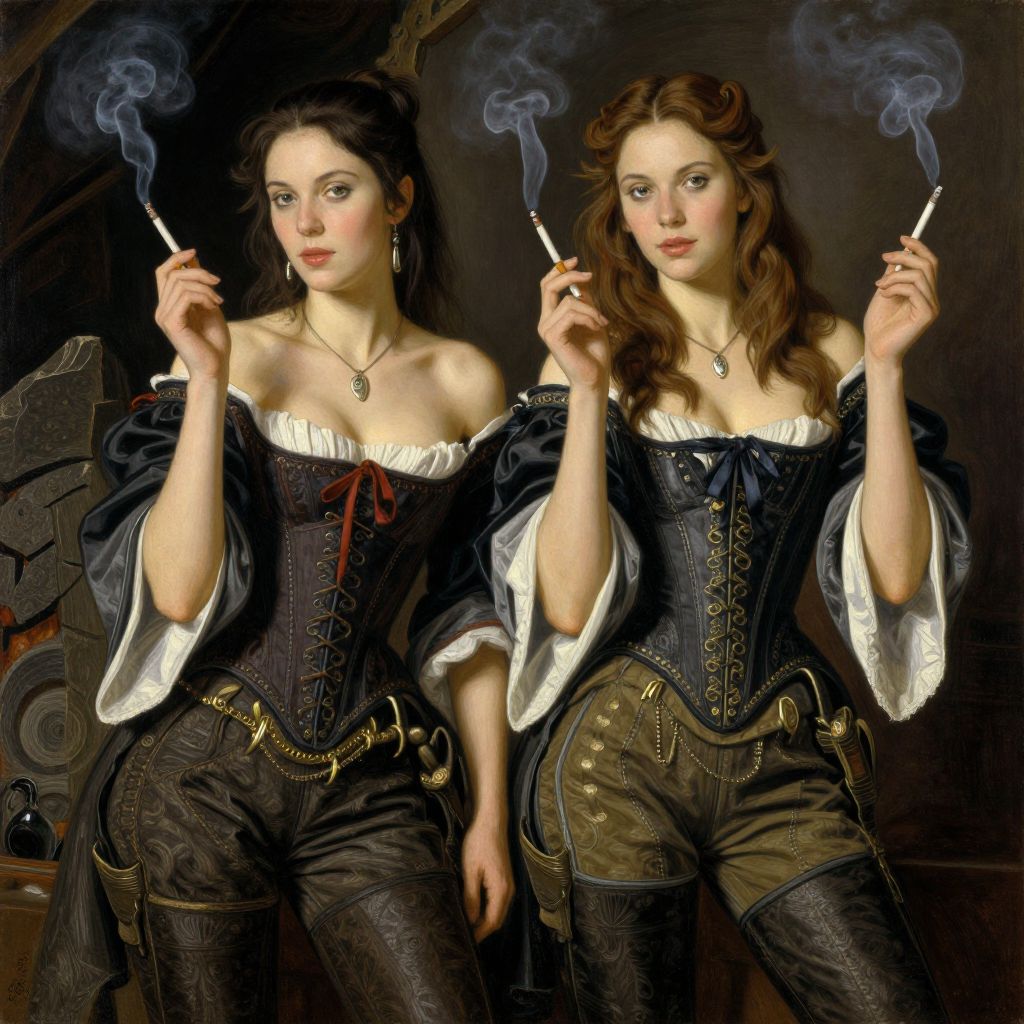 This digital painting depicts two young women with fair skin and European features, standing side by side against a dark, ornate background. Both wear black, off-the-shoulder corsets with white lace trim, brown puffed-sleeve shirts, and intricately patterned brown pants with gold accents. Their brown, wavy hair is styled loosely. They each hold a lit cigarette in their right hand, with smoke curling upwards. They wear small, gold necklaces and earrings. The dark background features a wooden chair with carved details on the left. The overall style is realistic with a painterly texture, emphasizing the women's confident, slightly rebellious expressions.
