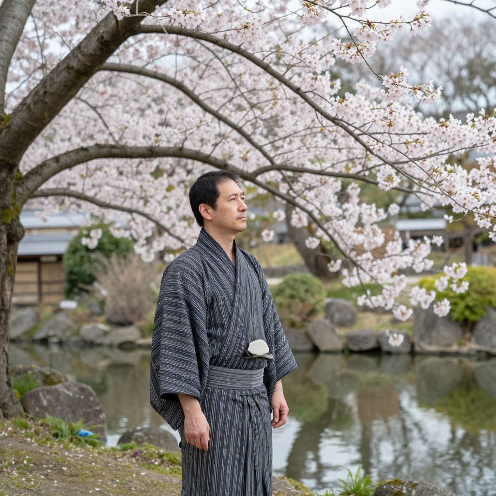 A man dressed in a traditional Japanese yukata stands thoughtfully under the delicate pink blossoms of cherry trees, with a serene pond and lush greenery in the background, invoking a sense of tranquility and cultural heritage.