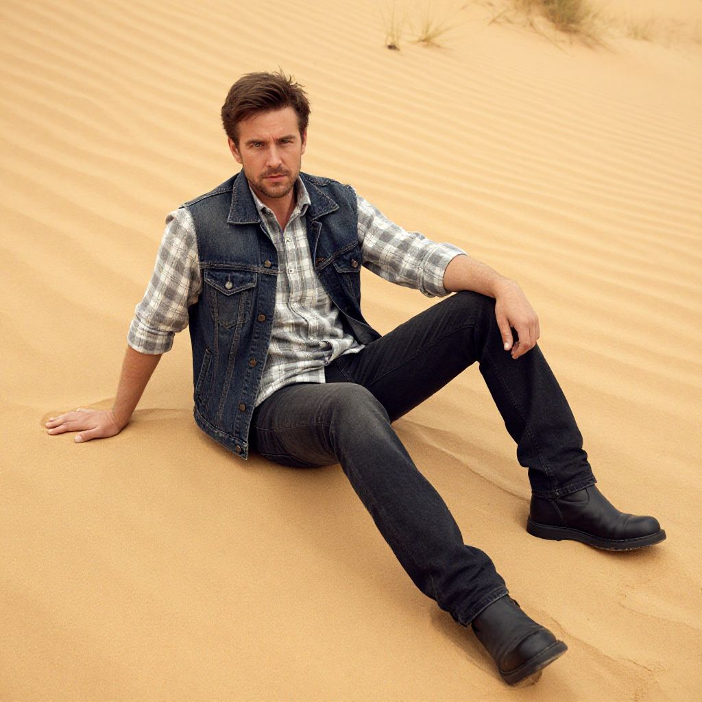 Photograph of a brown-haired man in a plaid shirt, denim vest, black jeans, and boots, sitting in a sandy desert.