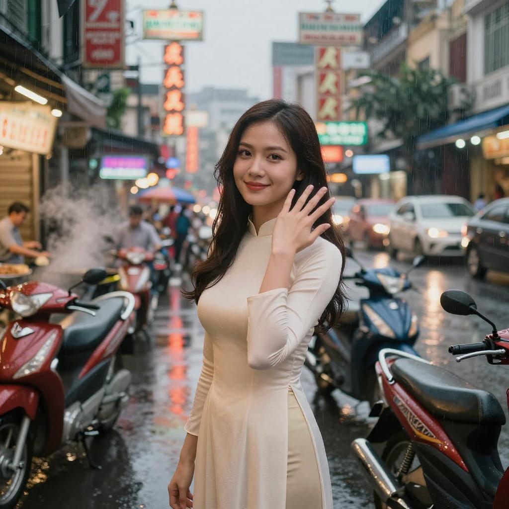 (8k, RAW photo, best quality, masterpiece:1.2), (realistic, photo-realistic:1.37), 1woman, elegant Vietnamese woman with long dark hair and traditional ao dai dress, cute:1.2, bustling Saigon street corner with motorbikes and neon signs, warm tropical evening rain with heavy humidity, glossy puddles reflecting neon and vehicle lights, steam rising from woks and barbecue grills, visible raindrops and light misty haze, professional lighting, rim light, photon mapping, radiosity, physically-based rendering, PBR, atmospheric perspective, front-facing, whole body, delicate face, soft smile, looking at viewer, five fingers, natural skin, minimal makeup, DSLR street photography, 35mm lens, shallow depth of field, film grain, high contrast, color graded, candid vibe, selfie pose