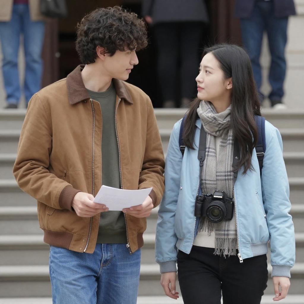 Winter scene of a man and woman standing on a snow-covered street facing a snowman with a carrot nose and striped scarf. The woman is wearing a beige jacket, blue jeans, and black boots, while the man is dressed in a dark suit jacket, gray scarf, and brown shoes. The snowman holds a brown and yellow bag. In the background, other people are building snowmen near two-story brick houses and green hedges.