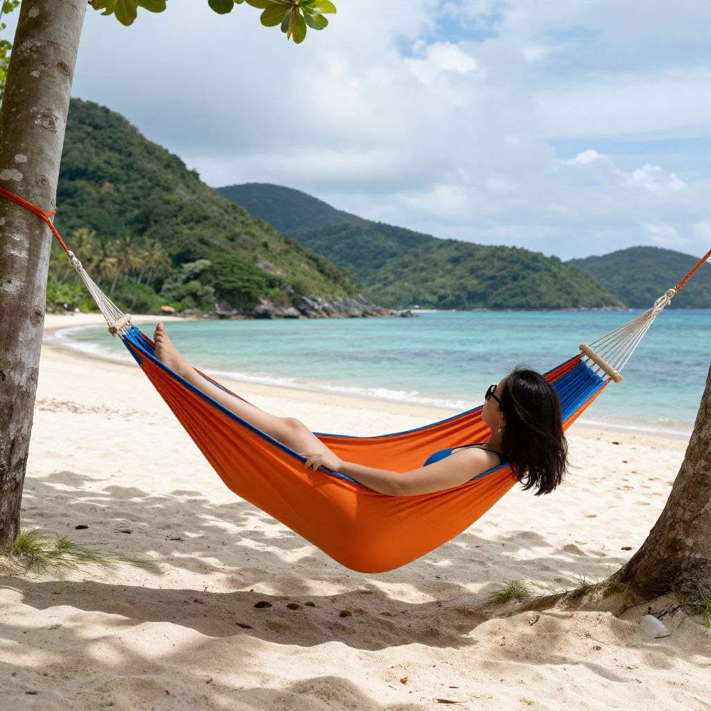 Woman lounging in a vibrant orange-and-blue hammock on a pristine sandy beach, surrounded by lush green mountains and turquoise waters under a partly cloudy sky.