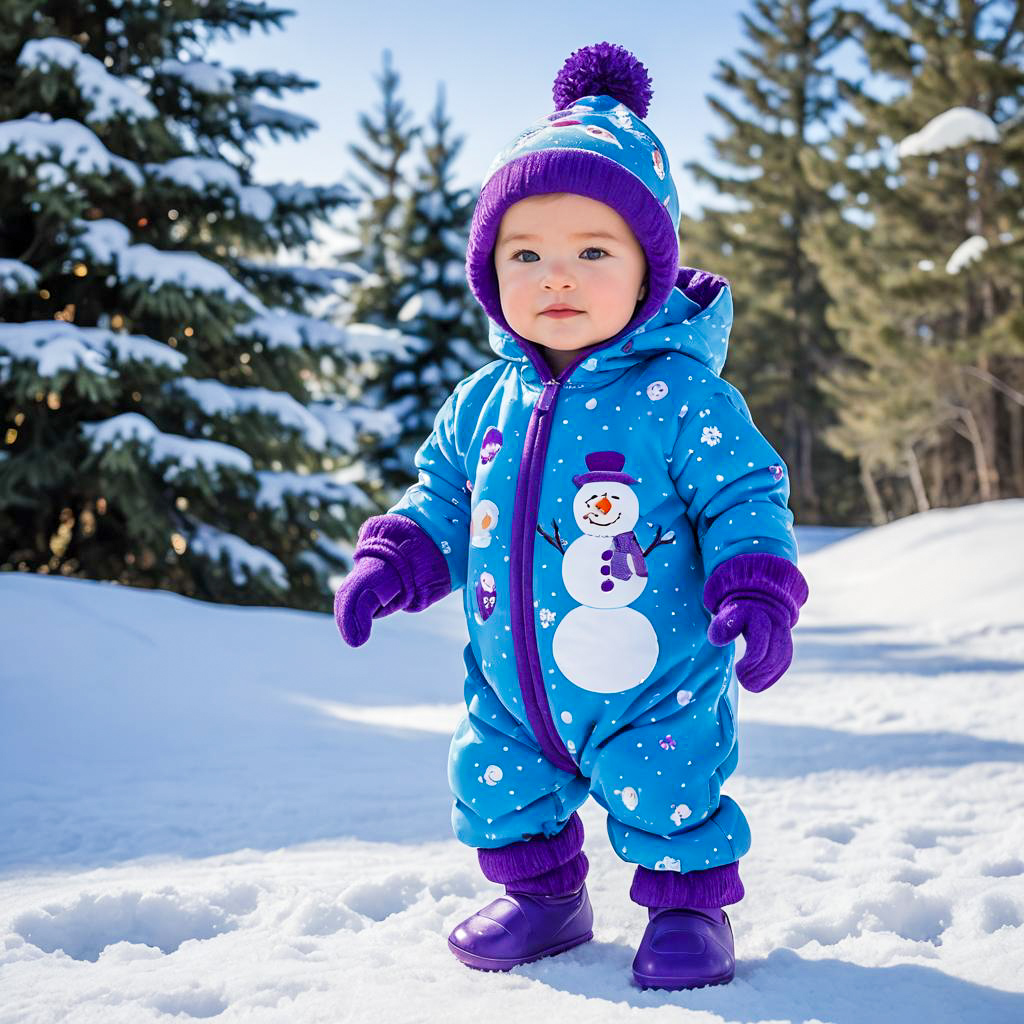 Baby girl Christmas outfit, worn by playful baby, featuring blue snowman romper with matching booties, in purple and blue, set against outdoor snow-covered landscape with snowman.