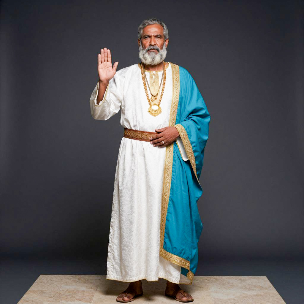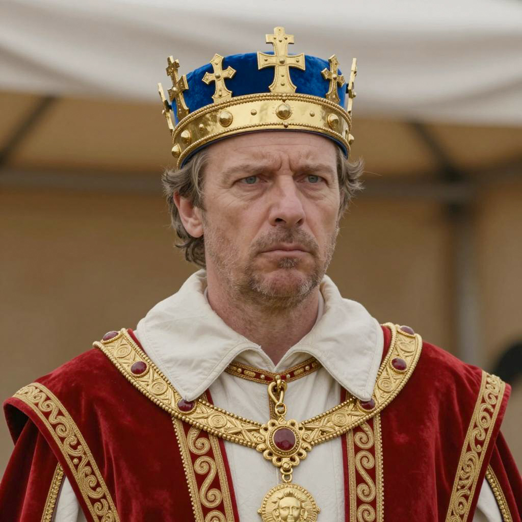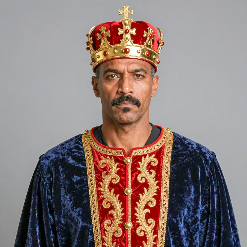 Strong man costume adult, photograph of middle-aged man with dark skin, short black hair and mustache, wearing elaborate red and gold royal crown with intricate patterns, dark navy blue velvet robe with red and gold embroidery, gold buttons, serious expression, neutral background, studio lighting, realistic portrait, regal attire, detailed ures, symmetrical composition, realistic style