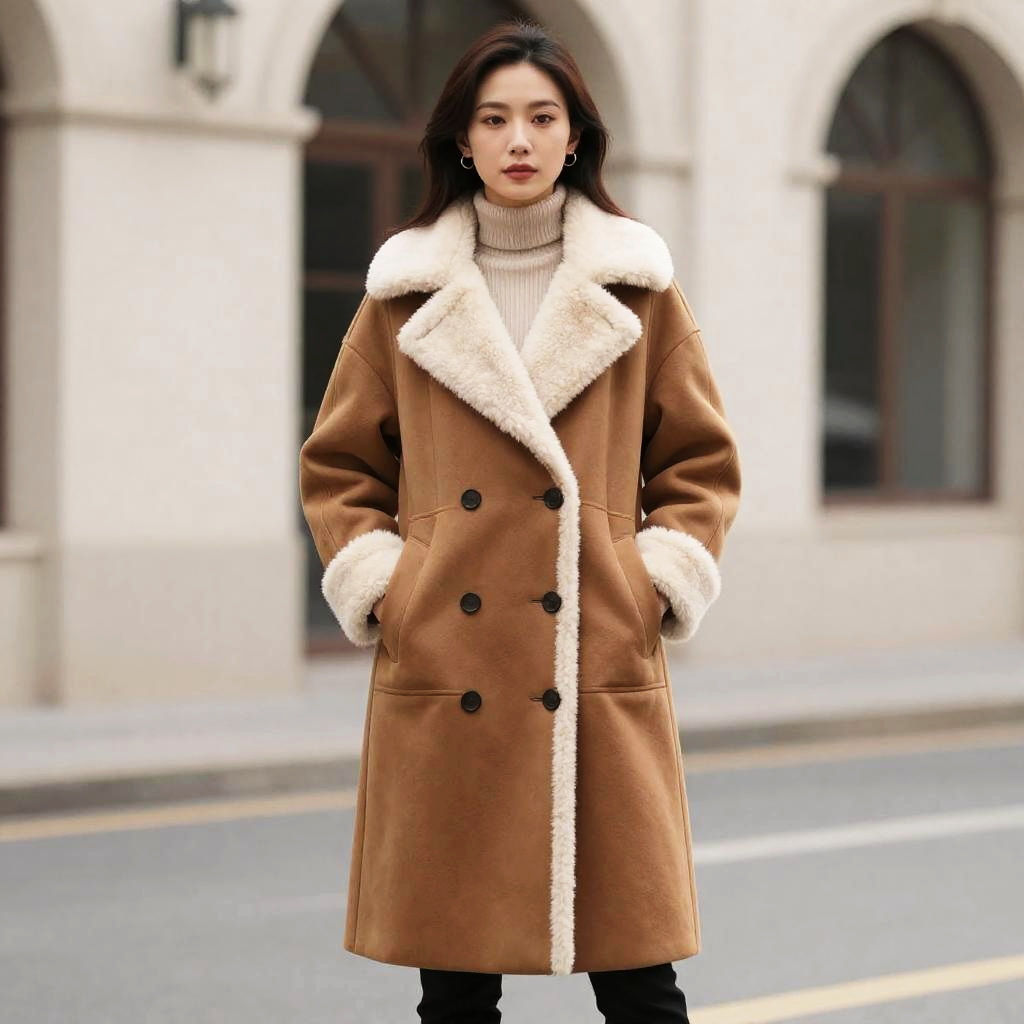 Shearling Coat Costume, woman in a brown coat standing in front of a building