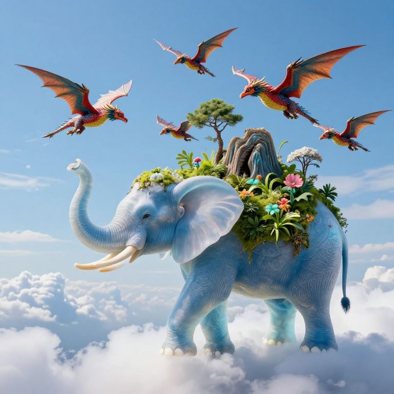A translucent elephant with ethereal blue skin cradles a lush, miniature ecosystem on its back, where a flock of vibrant dragons soars among floating clouds, defying gravity in a whimsical dance.