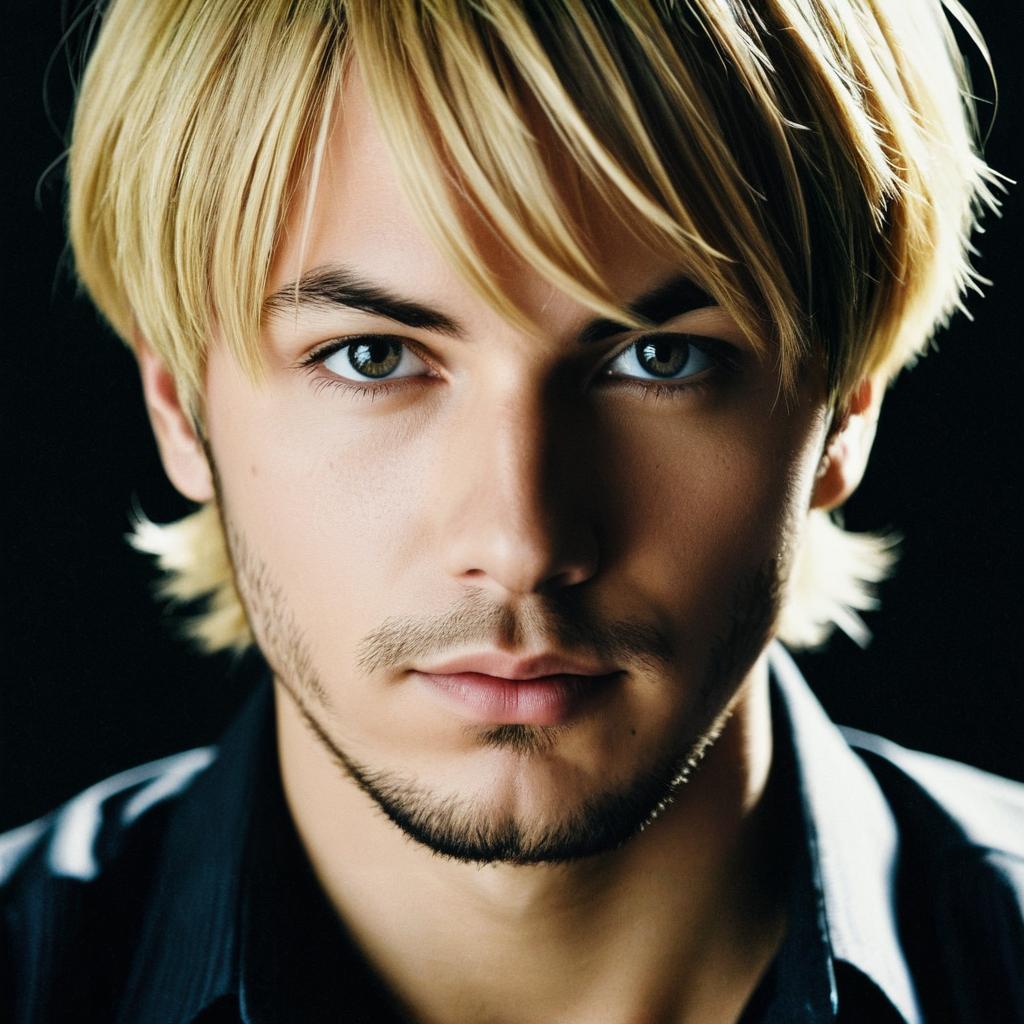 Spiky hair hairstyle male,1boy, male focus, solo, realistic, tank top, looking at viewer, closed mouth, spiked hair, upper body, blonde hair, suspenders