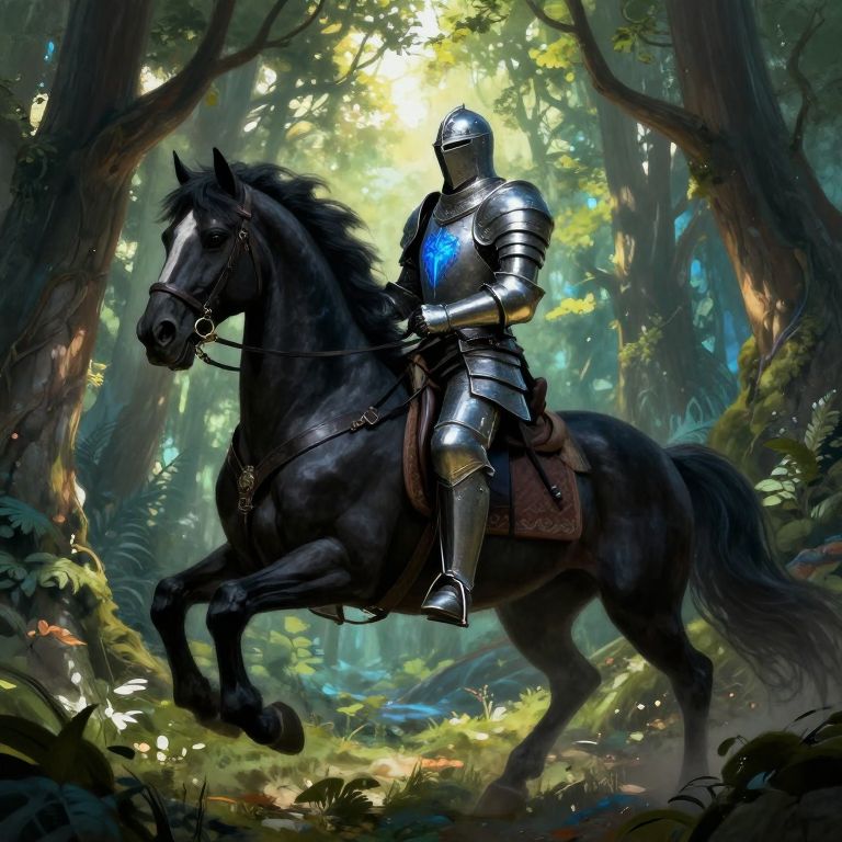 Digital artwork of a red-haired knight in shiny black armor riding a dark brown horse, with a lightning bolt in a stormy sky backdrop.