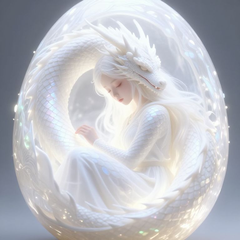 White dragon girl curled up within a luminous dragon egg, bathed in soft white light, intricate scales reflecting iridescent hues, fantasy illustration with dreamy atmosphere, close-up focus on delicate features and mystical environment.