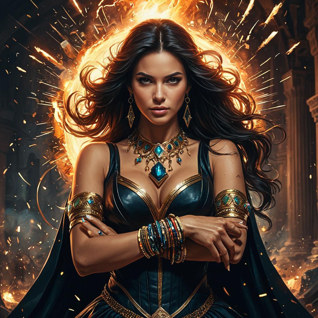 Digital painting of a fantasy female magician with long dark flowing hair, wearing an elegant black and gold corset dress adorned with intricate jewelry including numerous bangles, arm bands, and a statement necklace with blue gemstones. She stands confidently with arms crossed in front of a dramatic explosion backdrop in a mysterious ancient temple-like setting. Highly detailed and sharply focused concept art with a magical and powerful atmosphere.