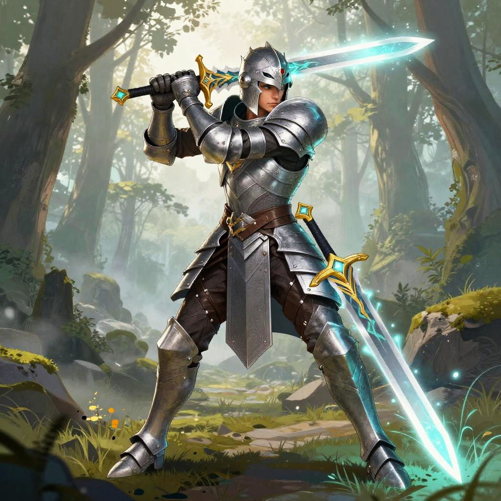 Digital artwork of a muscular knight in shining armor, wielding glowing blue swords, standing in a sunlit, mystical forest clearing.