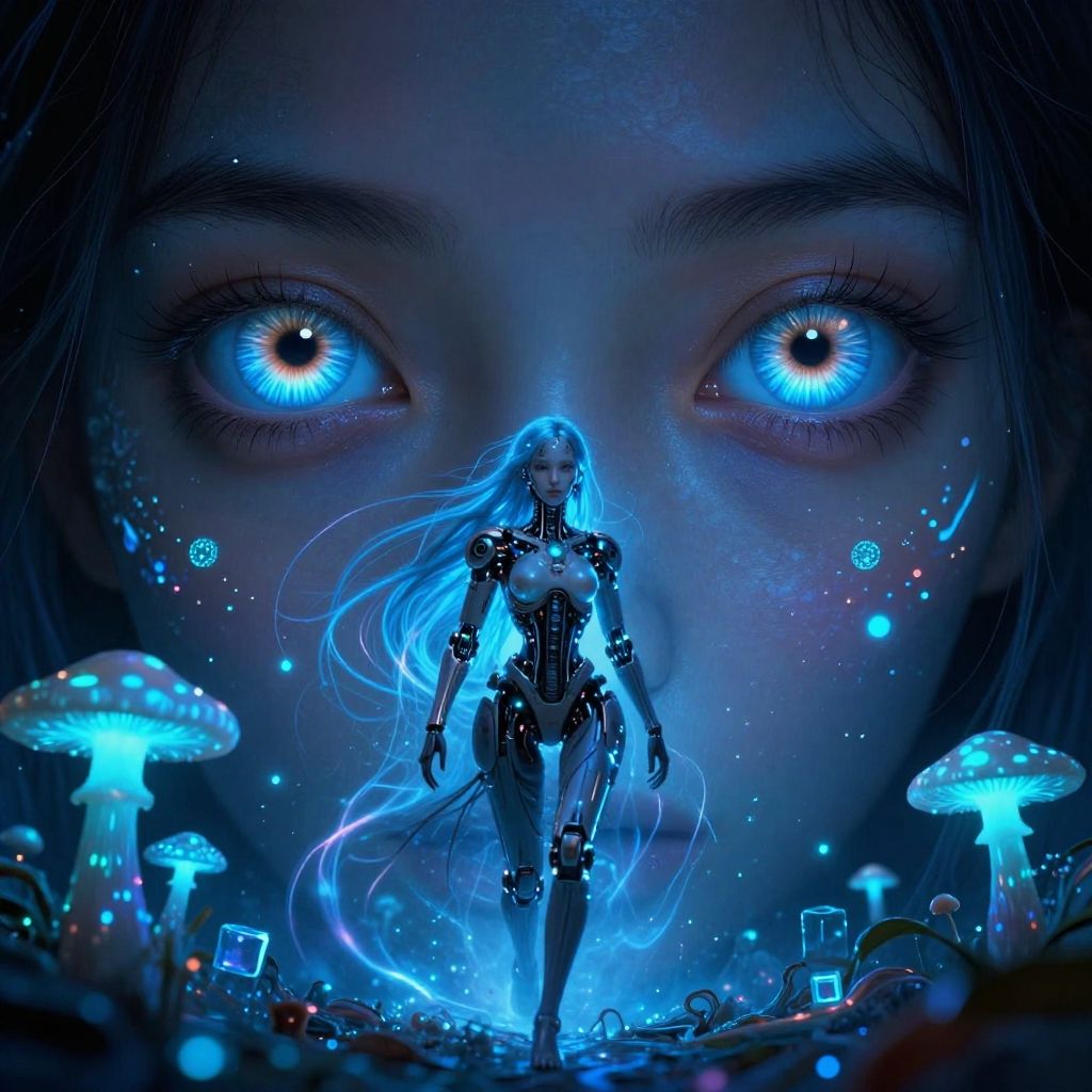 Digital artwork depicting a glowing blue, long-haired woman with an ethereal, robotic appearance standing in a surreal, bioluminescent forest. Her eyes match the glowing blue theme, and she is surrounded by glowing mushrooms, floating cubes, and sparkles. The background features a large, close-up view of a face with similarly glowing eyes, creating an intense, otherworldly atmosphere. The woman's figure is sleek and futuristic, with visible mechanical elements, adding to the sci-fi fantasy aesthetic. The overall color palette is dominated by shades of blue and dark tones, enhancing the mystical, futuristic vibe.