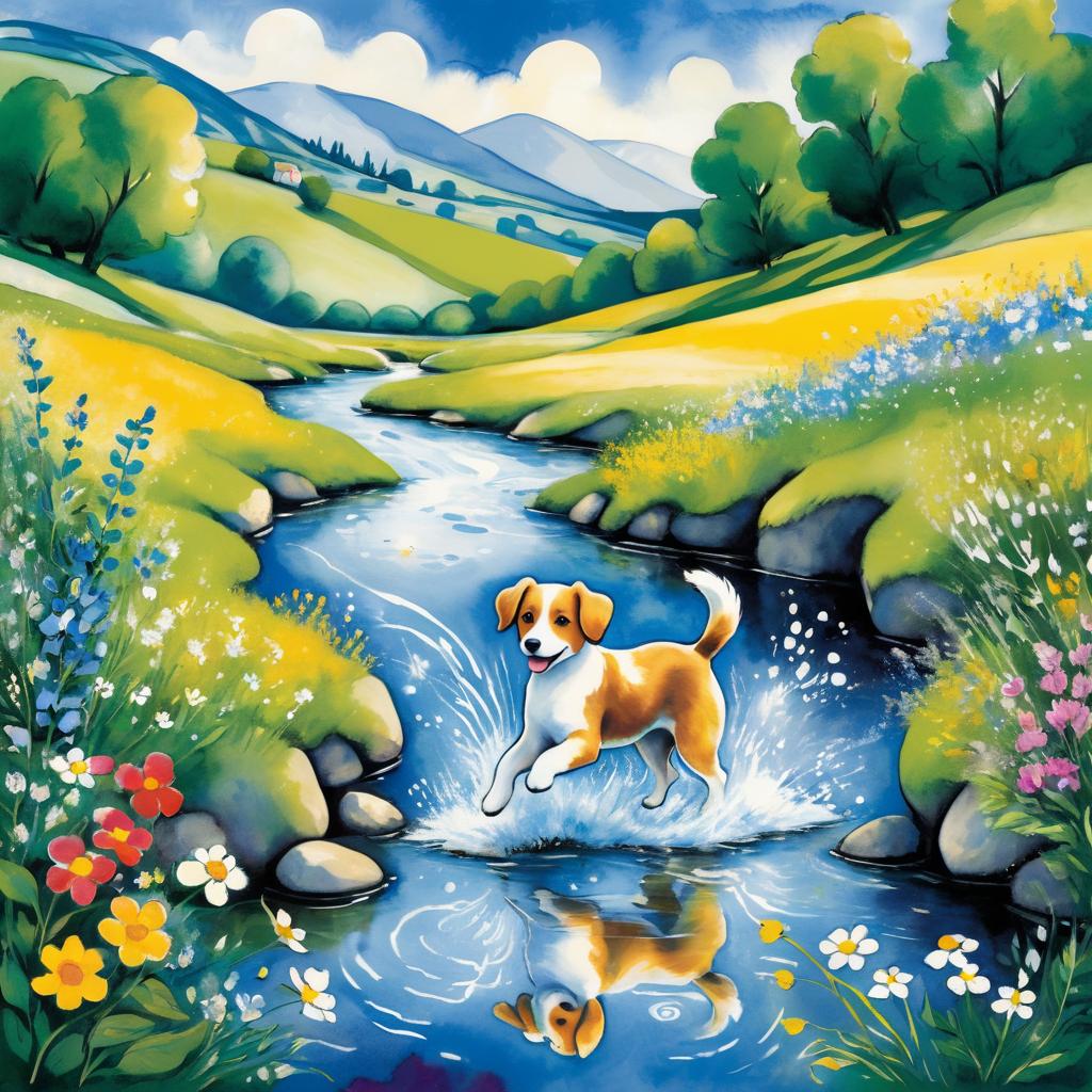Colorful illustration of a happy puppy splashing in a clear stream surrounded by vibrant wildflowers and greenery with rolling hills and mountains in the background under a bright sky.