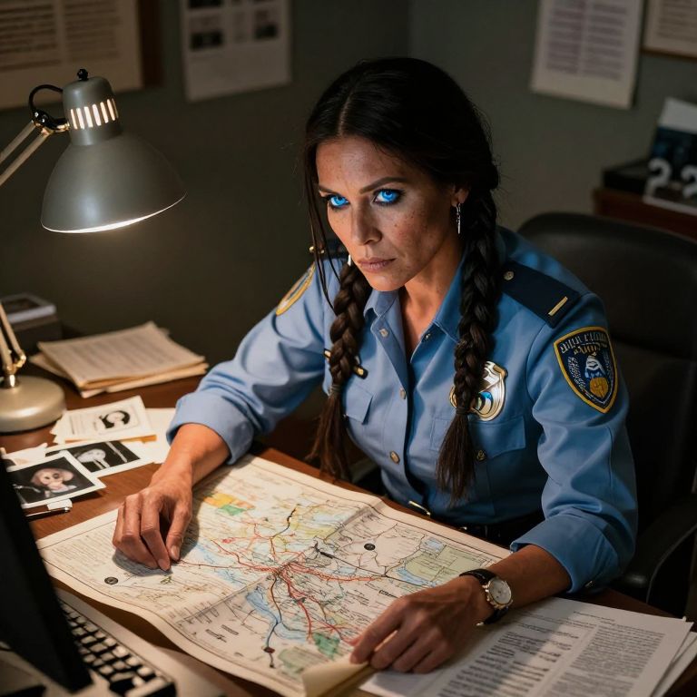 An ultrarealistic portrait featuring a Native American female detective with piercing blue eyes and porcelain skin commands attention. Illuminated by the soft glow of a flickering desk lamp in her cluttered office, she exudes an enigmatic aura as she concentrates intensely on examining a cryptic map spread out before her. Scattered case files, photographs, and forensic evidence surround her, emphasizing the complexity of her work. From an unconventional 'dragon's-eye view' perspective, this portrait captures the interplay of light and shadow across her time-worn features, inviting viewers to delve deeper into her captivating presence while evoking both reverence for her intellect and curiosity about the hidden mysteries she pursues.