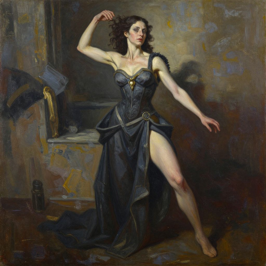 Baroque-style painting of a pale-skinned, dark-haired woman in a black, corseted gown with gold accents, posing gracefully in a dim