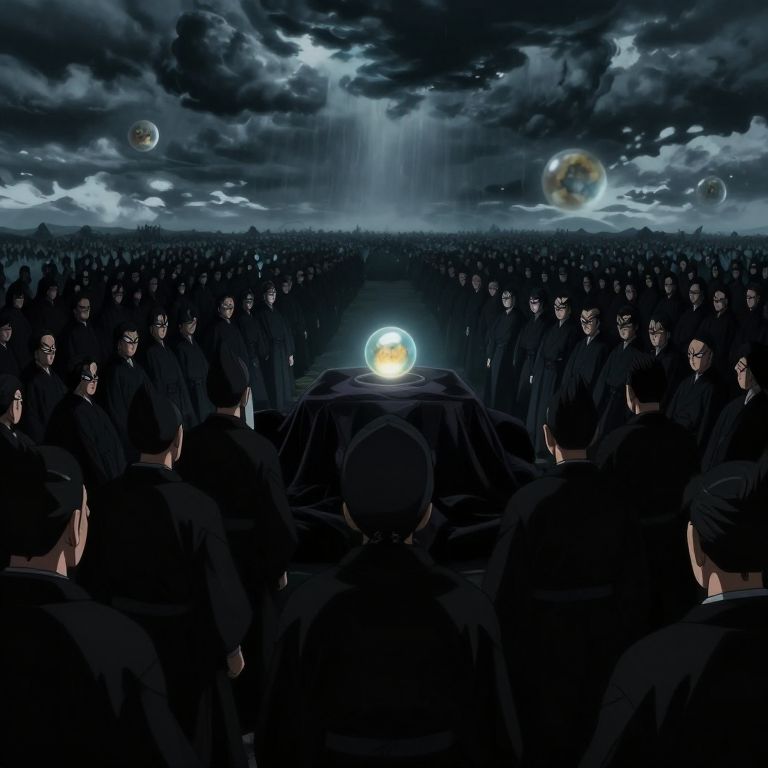 Dragon Ball funeral featuring a large crowd of iconic characters in black robes, stormy sky, floating Dragon Balls emitting faint light, emotional atmosphere, highly detailed anime style