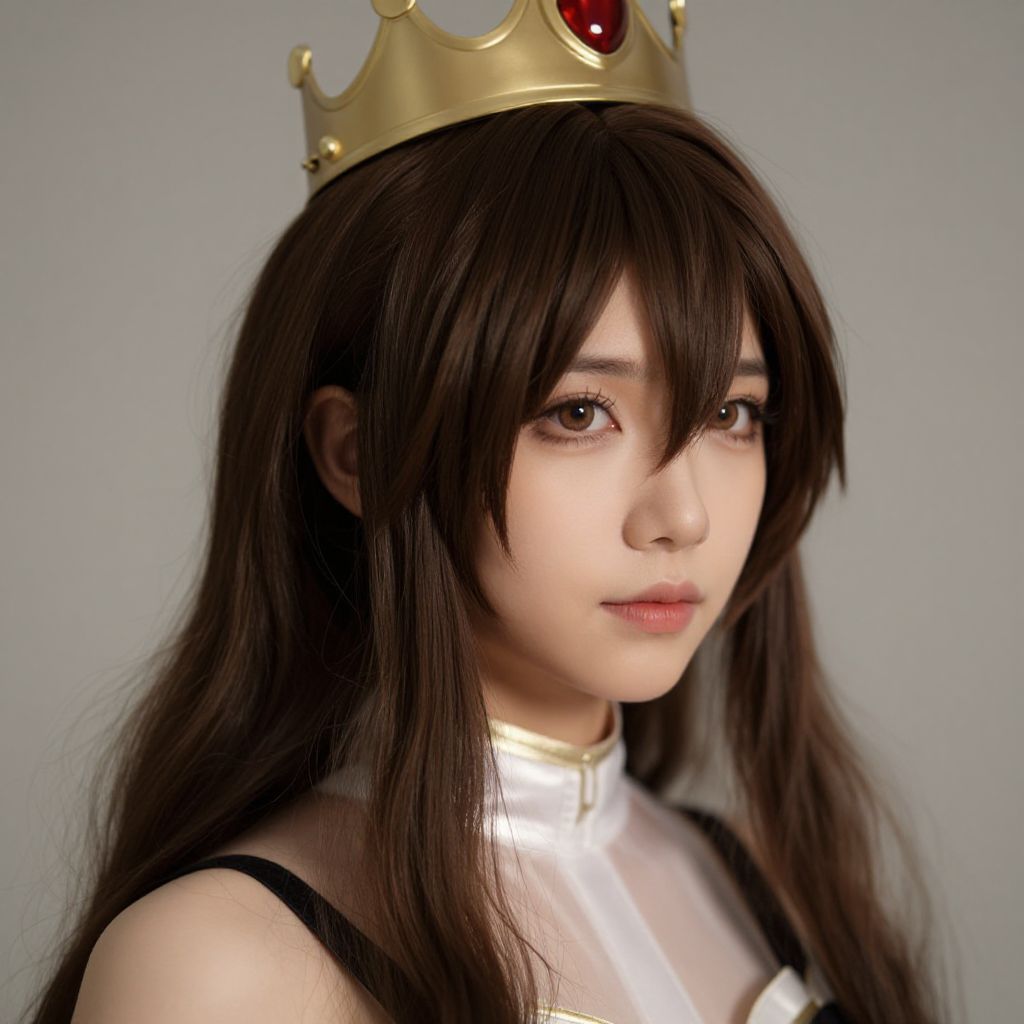 Photograph of an Asian woman with long, straight, dark brown hair and bangs, wearing a gold crown with a red gemstone. She has fair skin and is dressed in a white, high-neck, sleeveless garment with black straps. Her expression is neutral, with slightly parted lips and dark eyes. The background is a plain, light gray, and the lighting is soft, highlighting her face and hair. The image has a slightly surreal, digital effect, giving it a polished, almost CGI-like appearance.