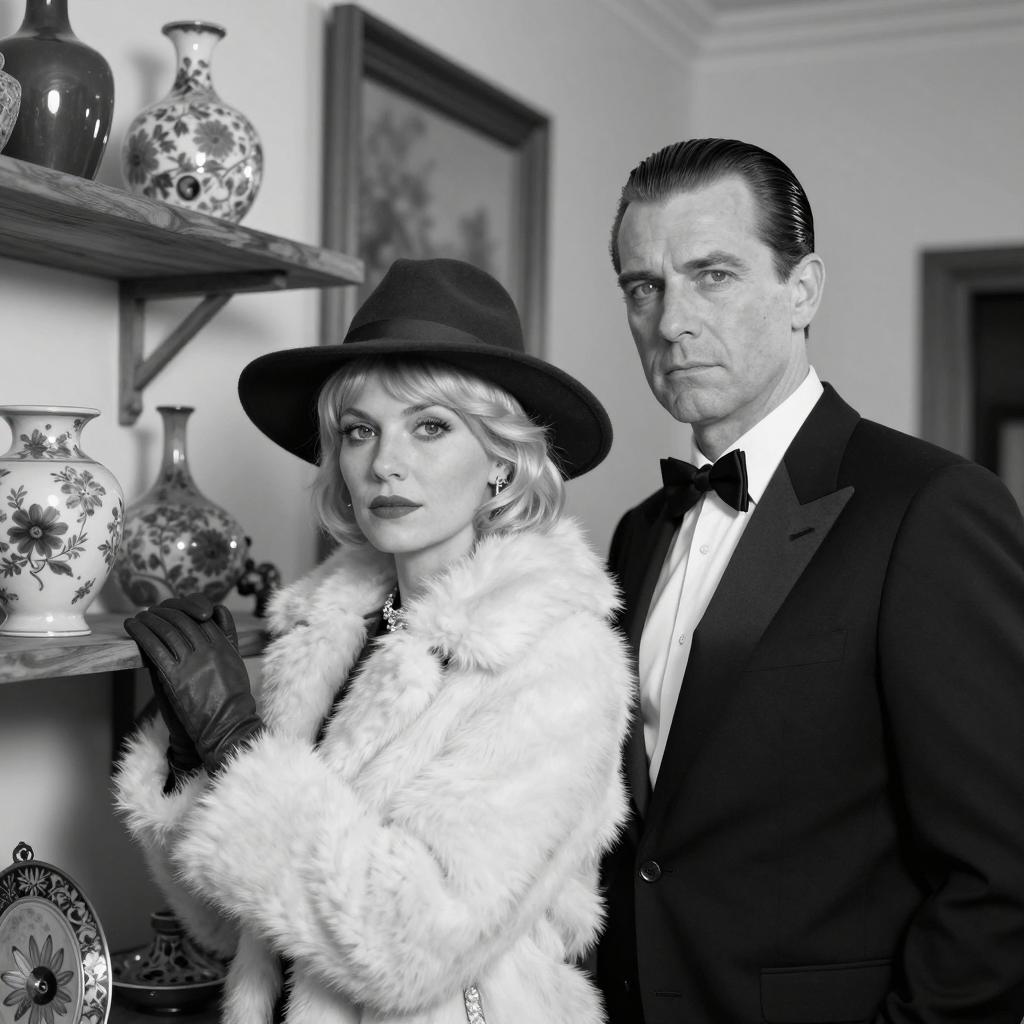 Black-and-white photograph of a man and woman sitting side by side. Woman with short, wavy hair, light-colored coat, and pearl earrings, smiling slightly. Man with slicked-back hair, dark suit, white shirt, and dark tie, looking to the right. Background has wooden paneling. Both have light skin. Man's right arm is crossed. Woman's left arm rests on her lap.