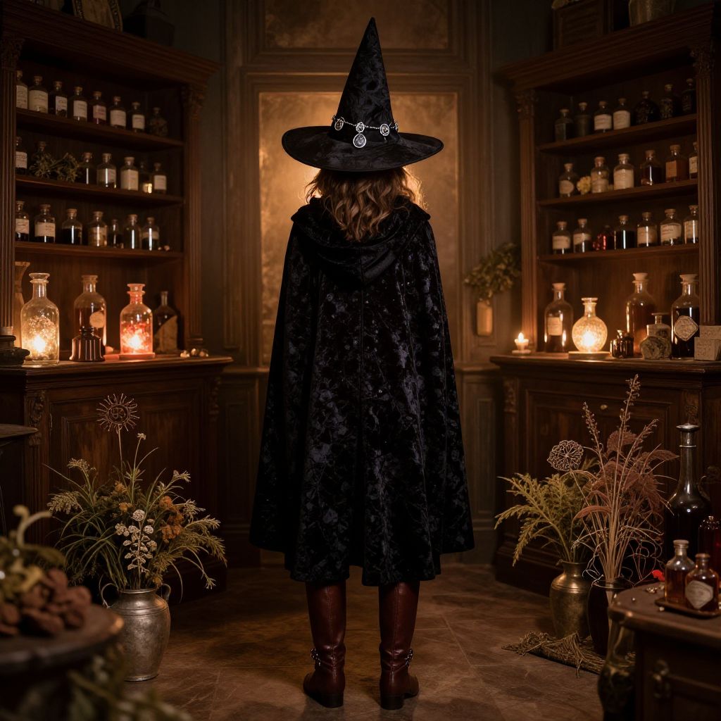 Witch costume aesthetic showcasing a stylish witch with a pointed hat adorned with silver charms, wearing a velvet cloak and leather boots, standing in a vintage apothecary filled with glowing potions and magical herbs, warm and eerie lighting.