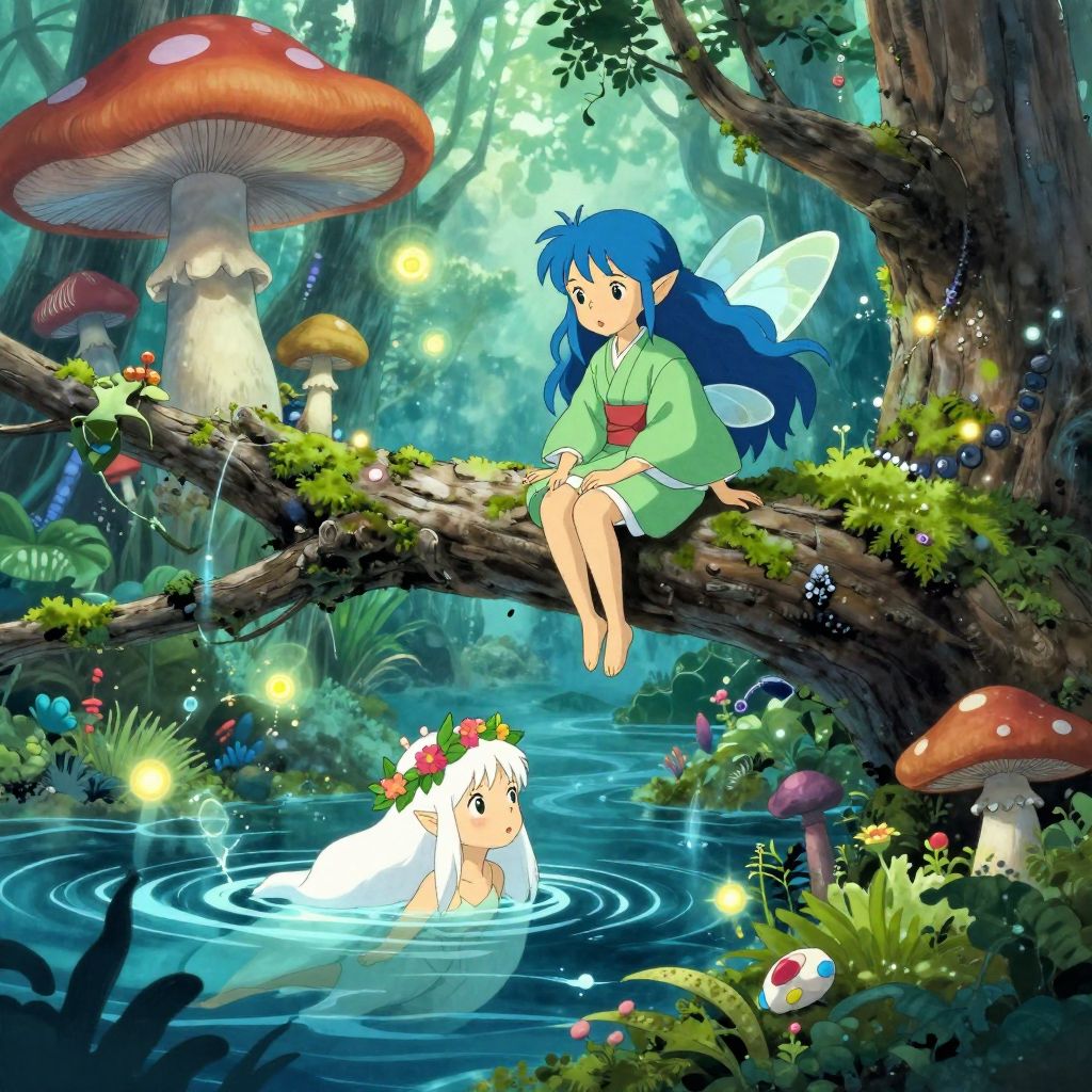 Minori, a fantasy scene featuring an ethereal forest guardian named Minori, glowing softly with mystical light, surrounded by ancient trees, magical flora and fauna, vibrant colors, dynamic composition, highly detailed and imaginative artwork.