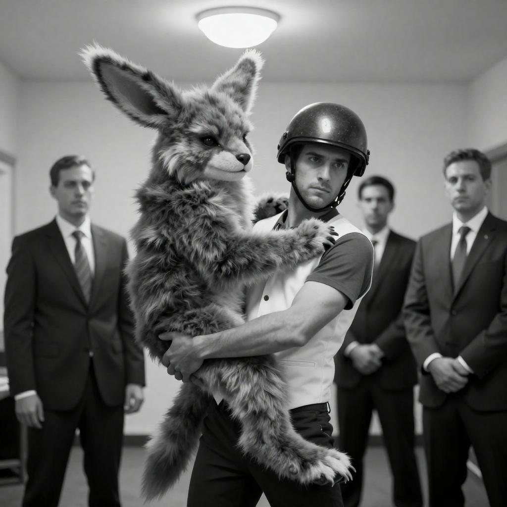 Black and white photograph of a man in a white vest carrying a large, furry creature with long ears and wearing a helmet. Three men in suits and ties stand in the background. The man carrying the creature has a serious expression. The creature is lifted off the ground, with its legs wrapped around the man's waist. The setting is an indoor room with a light fixture on the ceiling.
