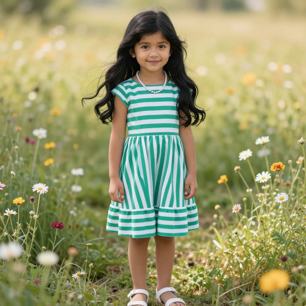 A beautiful young girl with long, flowing black hair, wearing a vibrant green and white striped dress that hugs her figure with a classic, elegant style. She has soft, expressive eyes and a warm, joyful smile, standing in a sunny meadow with blooming flowers surrounding her. She wears a delicate beaded necklace that glimmers in the sunlight, adding a touch of charm and detail, and pairs it with simple white sandals that match her clean, fresh look. The scene is bright and natural, with soft golden-hour lighting, evoking a sense of peace and innocence.