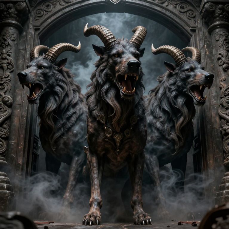 Demon three headed dog guarding an ancient gate, each head snarling fiercely, jagged horns, muscular body covered in shadowy smoke, dark fantasy with intricate details, cinematic lighting