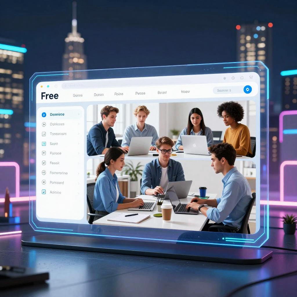 Ai banner generator free interface displayed on a transparent holographic screen, futuristic city skyline in the background, neon lighting, high-tech workspace, creative professionals collaborating remotely