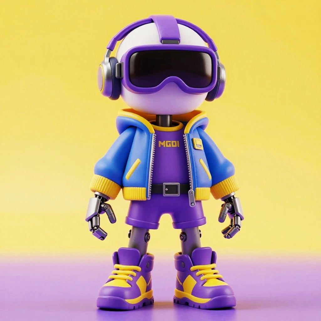 A futuristic cyberpunk toy figurine character with robotic limbs, wearing a blue and yellow jacket, purple shirt, shorts, large purple and yellow sneakers, and purple vr goggles with headphones, standing against a bright yellow background, vibrant neon purple and yellow colors, high contrast lighting