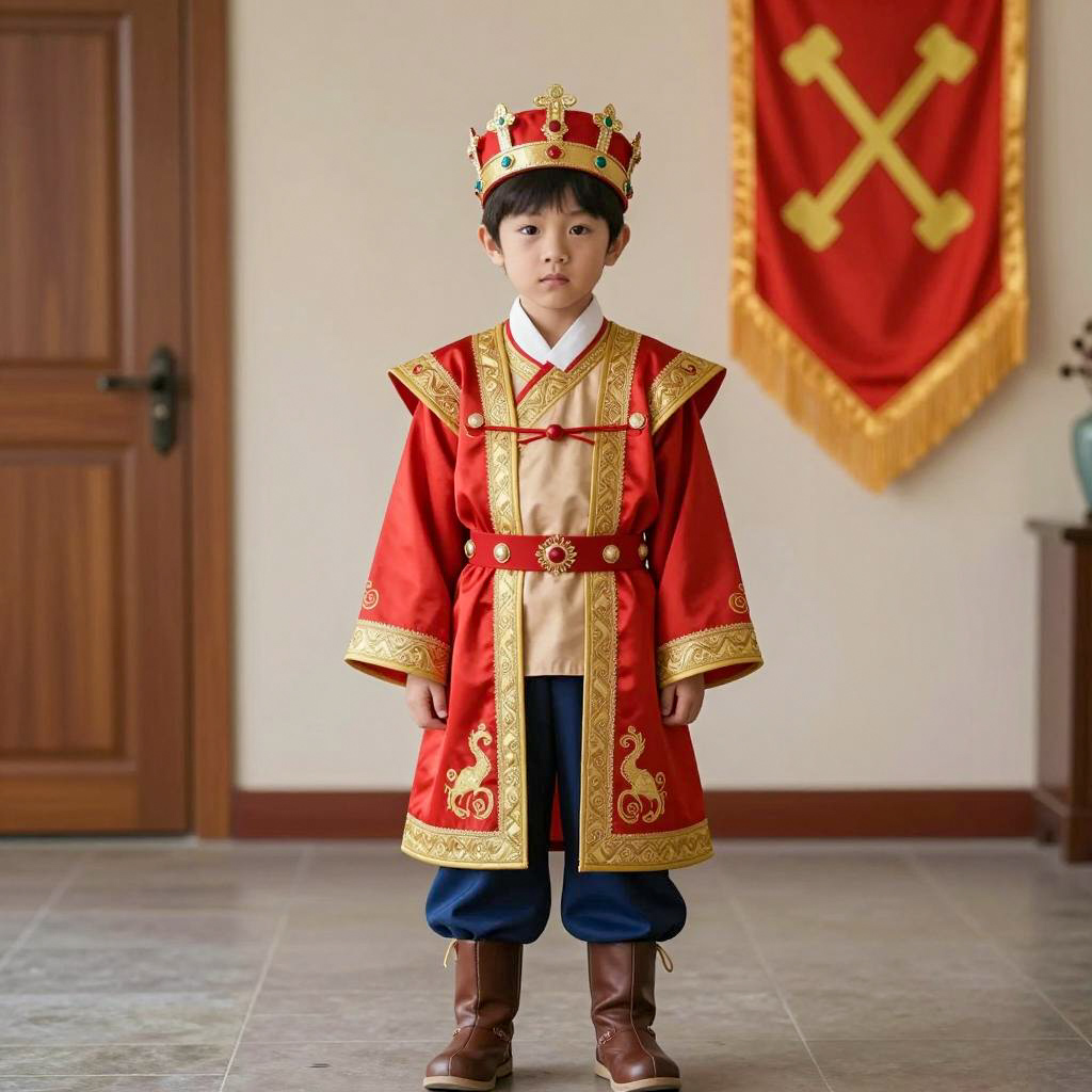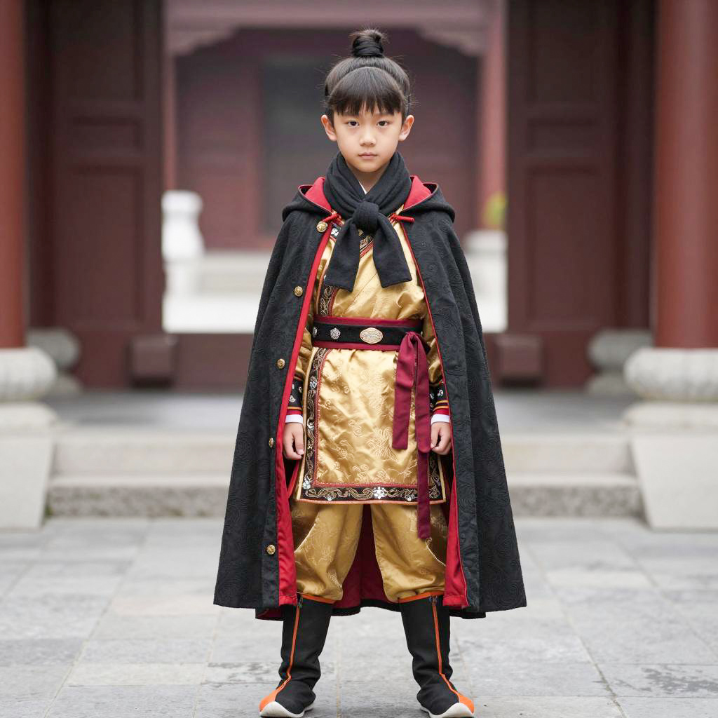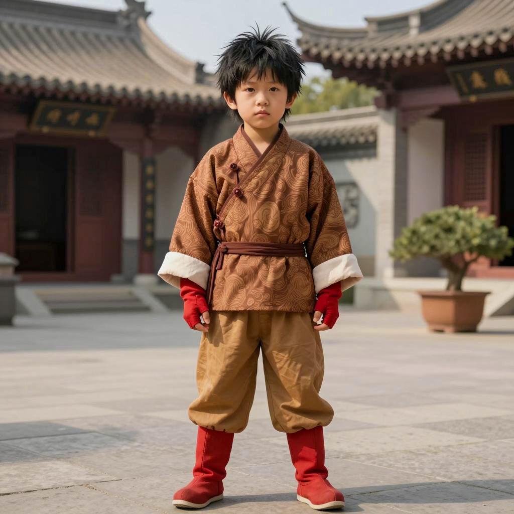 Huggy wuggy costume, photorealistic, boy, standing, traditional Chinese courtyard, daytime, loose brown patterned jacket, tan pants, red boots, fingerless gloves, shaggy black hair, serious expression, traditional Chinese building with curved roof in background, potted plant on the right, stone pavement, soft shadows, clear sky, detailed ures, traditional clothing, realistic lighting, front view, full body