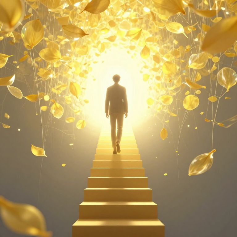 Digital artwork depicting a silhouetted figure in a suit walking up a golden staircase towards a bright, glowing, yellow-orange light. Surrounding the staircase, numerous yellow and gold leaves float in the air, illuminated by the radiant light. The background is a dark, gradient blue, enhancing the luminosity of the foreground. The figure's head is shadowed, making facial features indistinguishable. The image conveys a sense of ascension or enlightenment. The overall style is surreal and dreamlike, with a focus on golden hues and dynamic lighting.