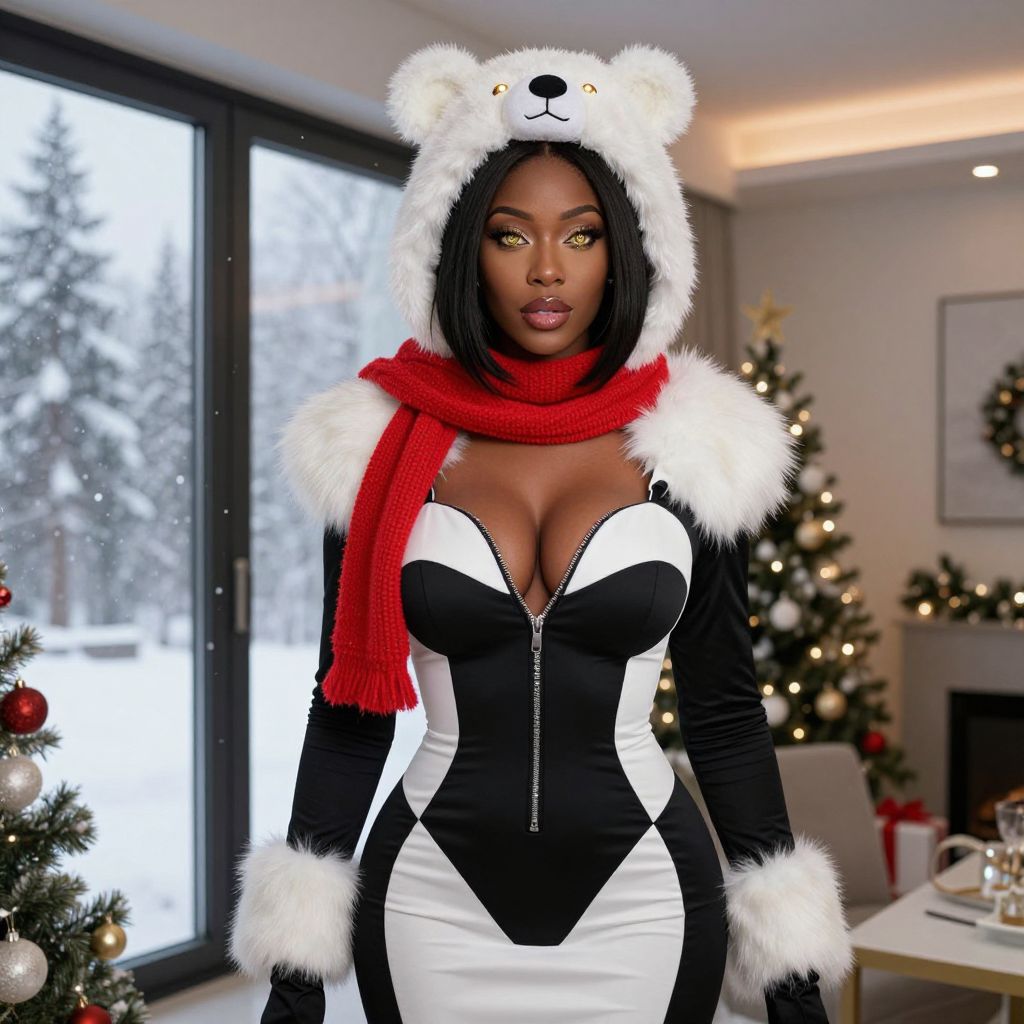 A confident, tall woman with deep brown skin, straight black hair, and sparkling gold eyes is at a winter birthday celebration in a modern holiday apartment, dressed in a luxurious black and white zipped winter dress with a fur collar, wearing a festive costume of a polar bear with a red scarf and glowing eyes, standing by a window with a winter landscape outside, snow falling softly in the background, the lighting warm and cinematic.. The woman has big breasts and cute face
