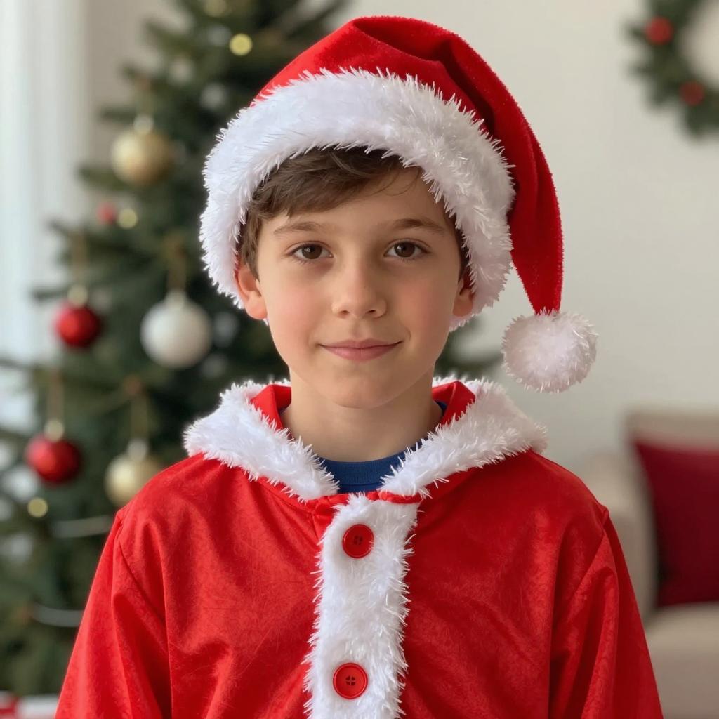 Photorealistic image of a young Caucasian boy wearing a traditional European white shirt with red embroidery, red suspenders, red pants, and a red Santa hat. The boy stands on a winter evening street decorated with Christmas lights and garlands. The background shows a blurred holiday market with illuminated stalls and streetlights, creating a warm festive atmosphere. The boy has a serious expression, highlighting the detailed and authentic traditional attire.