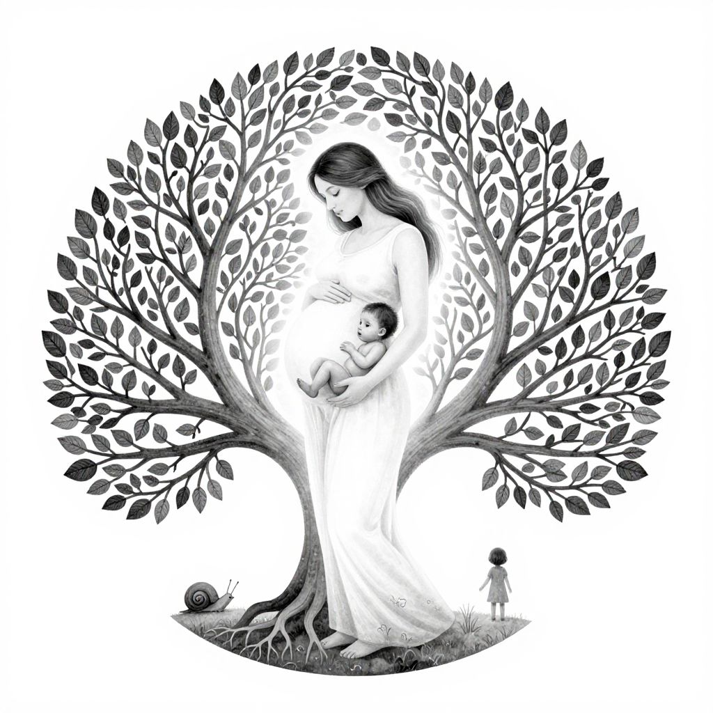 The image is a striking black and white illustration, predominantly white with subtle gray shading, depicting a pregnant woman cradling her belly. The scene is framed within a circular motif, evoking a sense of unity and completeness. The woman, with flowing hair, stands gracefully, her figure illuminated by a soft, ethereal glow. Nestled within her embrace is a fetus, symbolizing the connection between mother and child. Surrounding them is a detailed, intricate tree of life, its branches and leaves extending outward, creating a sense of growth and vitality. The tree's roots, visible at the base, anchor the scene, grounding it in a natural, earthy setting. In the background, a smaller figure, possibly a child, stands near a snail, adding a touch of whimsy and wonder to the composition. The overall effect is one of harmony, beauty, and the cyclical nature of life, with the woman, fetus, and tree of life forming a cohesive, interconnected whole.