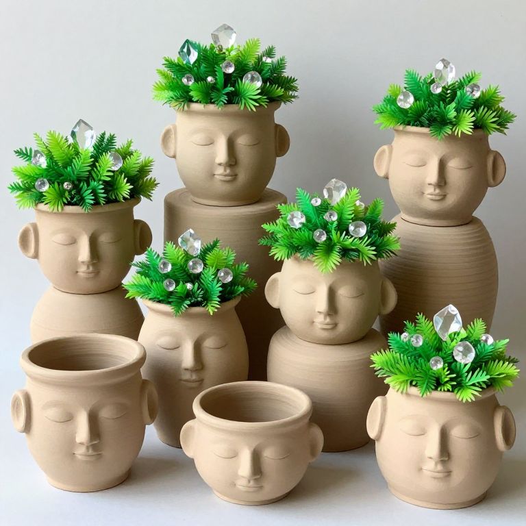 Various shapes of clay and ceramic pots with peaceful faces, adorned with vibrant greenery and sparkling crystals.