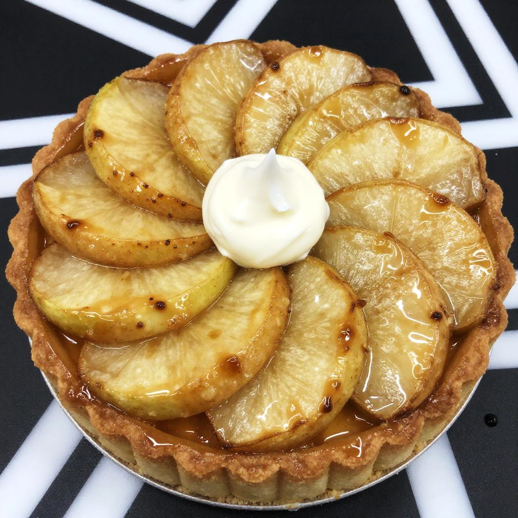 This is a close-up photograph of a beautifully baked dessert. The dessert has a golden-brown, fluted crust with a spiral pattern of caramelized apple slices on top, each slice glistening with a light glaze. A small dollop of white cream is at the center of the apple slices. The background is a black surface with white geometric patterns. The overall texture is smooth with a slightly glossy finish.