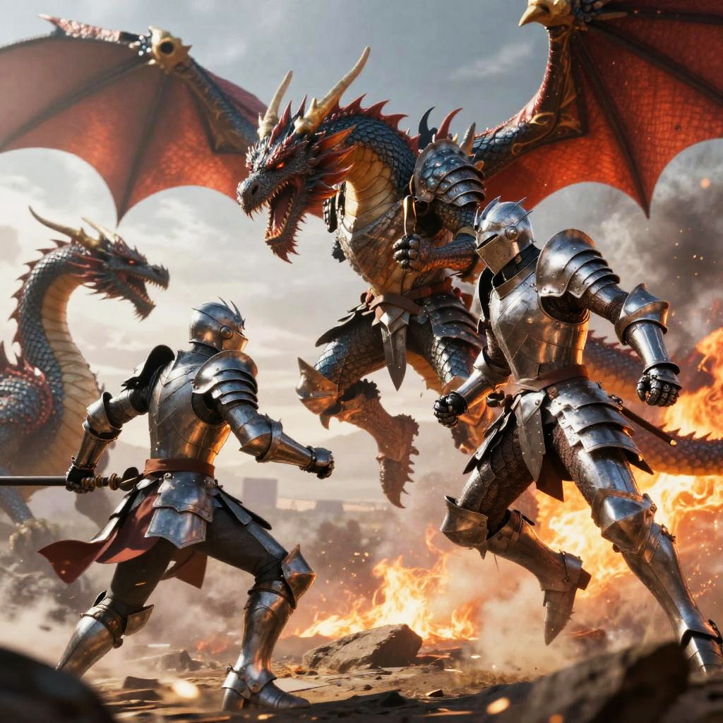Semi realistic anime fantasy battle scene featuring armored knights and dragons in mid-air combat, dynamic poses with motion blur effects, detailed scales and armor textures, fiery and smoky background with dramatic lighting, vibrant colors with a mix of realism and anime aesthetics.