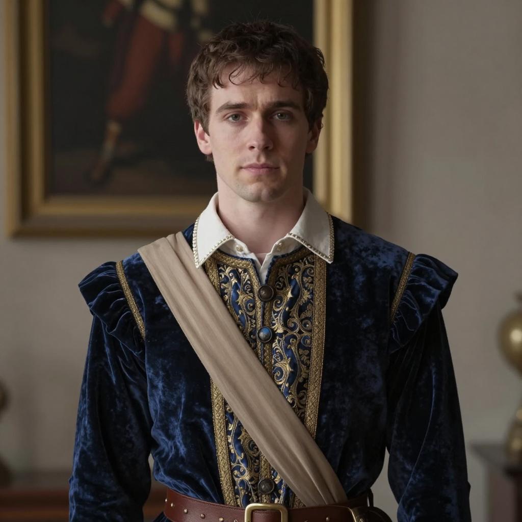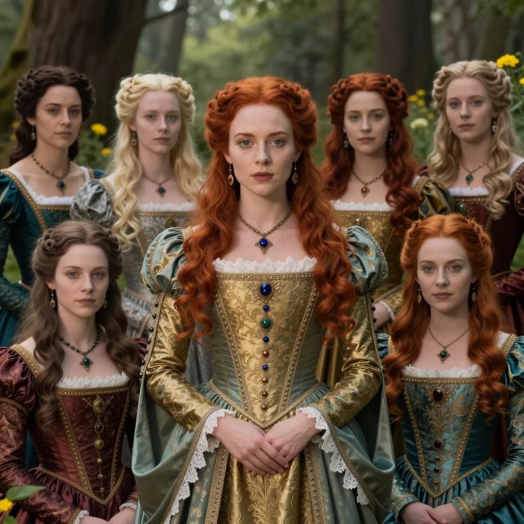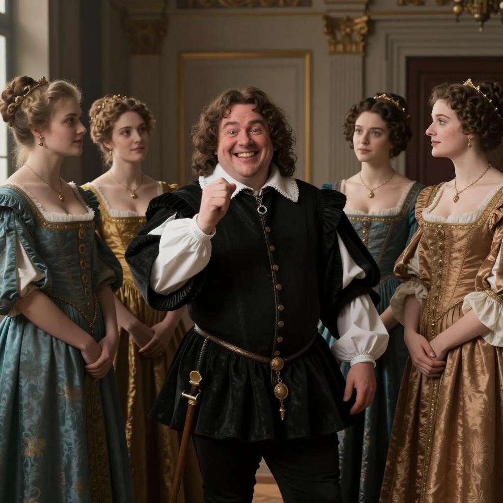 A Renaissance nobleman dressed in black velvet attire with white collar and sleeves, smiling broadly and holding a confident pose. Surrounding him are four elegant women in ornate, low-cut medieval noblewoman gowns in blue and gold tones, wearing gold jewelry and tiaras, standing indoors in a richly decorated lord's house from the year 1580. Warm lighting highlights the luxurious fabrics and detailed hairstyles of the subjects, capturing a historical and theatrical atmosphere.