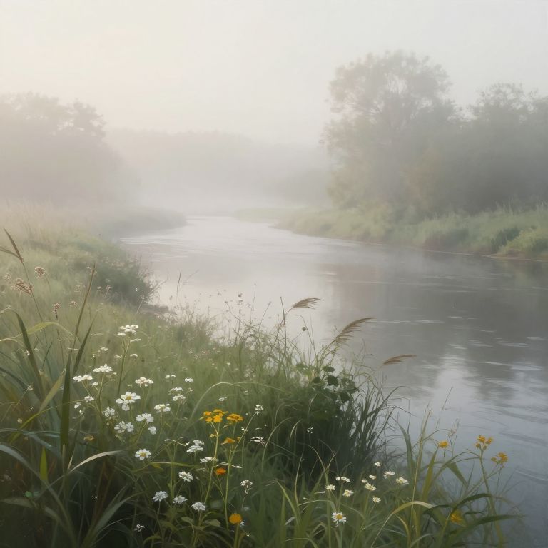 Wal in foggy morning mist along a quiet riverbank, delicate wildflowers and tall grasses waving in breeze, muted colors with soft light, peaceful and calm atmosphere, digital painting