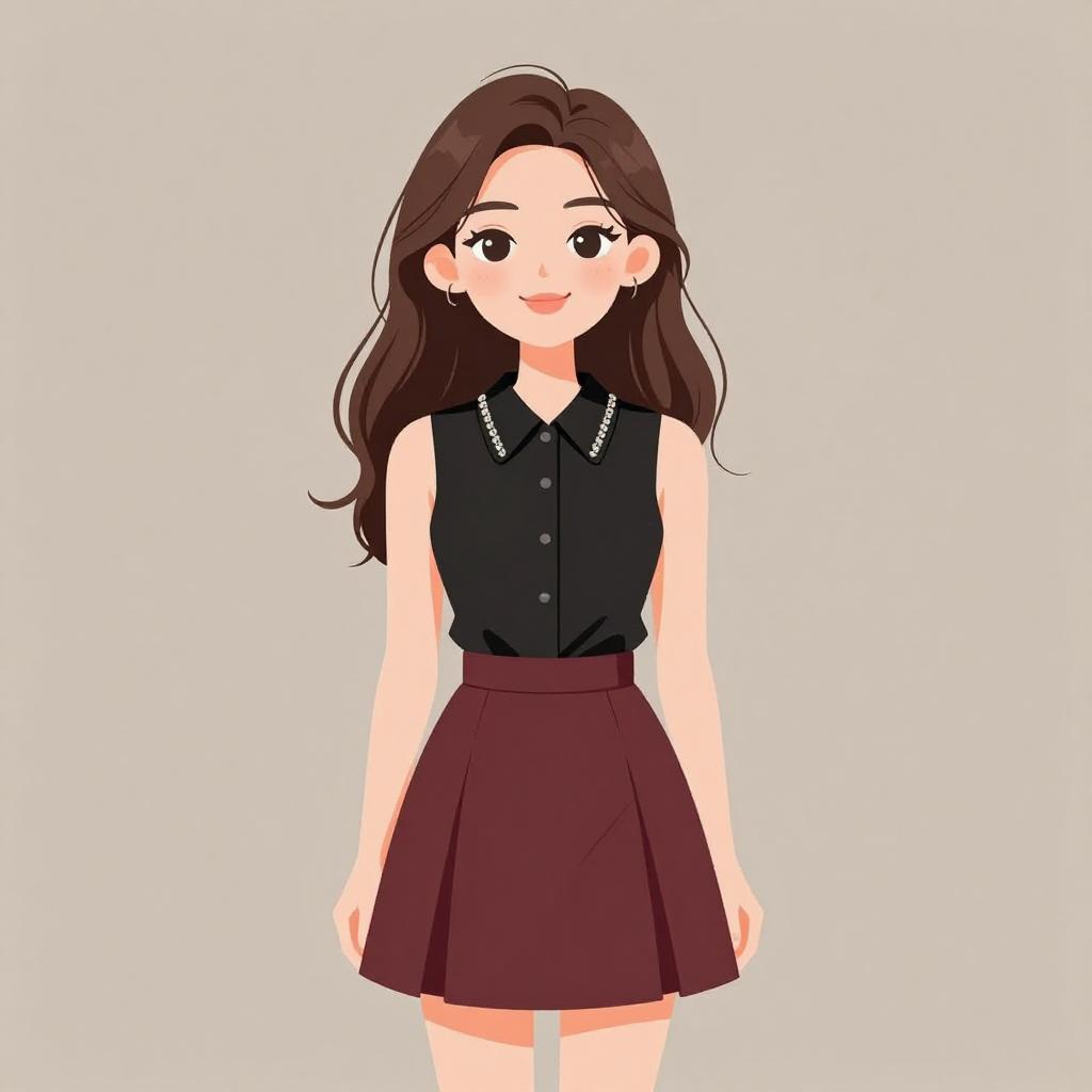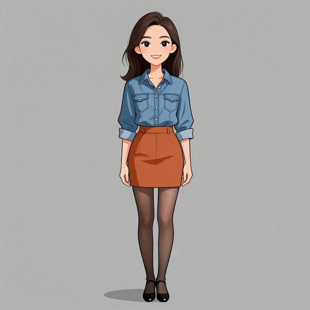 Woman with pretty face and pretty hair. smiling Woman, casual chic, blue denim button-up shirt, rolled-up sleeves, tucked into a high-waisted burnt orange textured mini skirt, sheer black tights, classic black ballet flats, simple straight hairstyle, studio grey background. --sref 1467