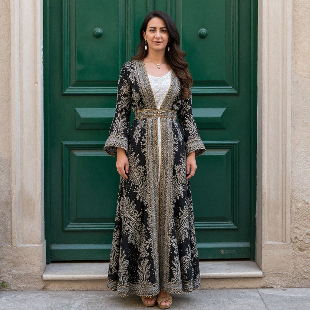 Photograph of a South Asian woman with medium brown skin and long, wavy black hair standing in front of a dark green, paneled door. She wears a black, long-sleeved, floor-length robe adorned with intricate gold embroidery, over a white, V-neck blouse. Her hands rest by her sides, and she wears gold hoop earrings and beige, strappy sandals. The background includes beige stone walls framing the door. She smiles softly, exuding a calm, confident demeanor. The image is brightly lit, highlighting the textures and details of her attire and the door.