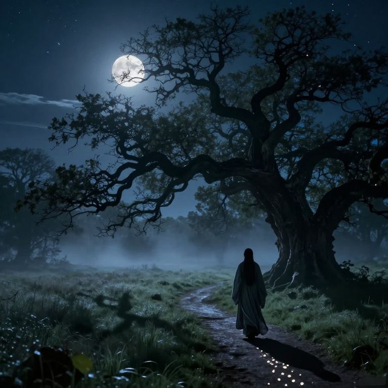 A mystical landscape illuminated by the soft glow of moonlight reveals an ancient tree standing at the edge of a misty forest clearing. The gnarled, twisted branches stretch towards the starlit sky like fingers grasping for celestial bodies, casting elongated shadows that gracefully dance upon the dew-kissed grass below. In the foreground, a solitary figure draped in flowing robes walks along the path, their face hidden by the enveloping darkness as they leave behind a trail of shimmering footprints that gradually dissolve into the night—a captivating and enigmatic scene reminiscent of a dreamlike realm, evoking an atmosphere both mysterious and enchanting.