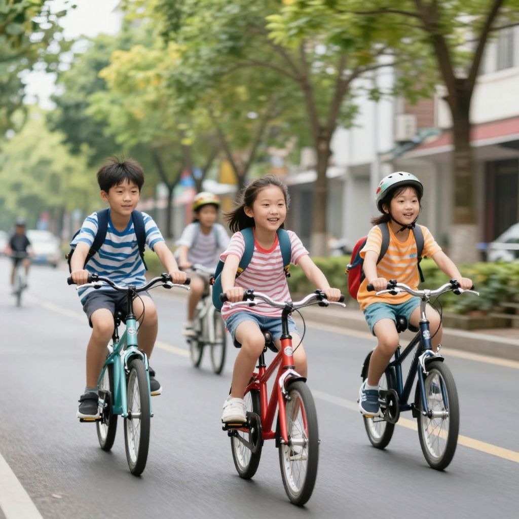 Photograph of three smiling Asian children riding bicycles on a tree-lined street, wearing backpacks and helmets, with a blurred background.