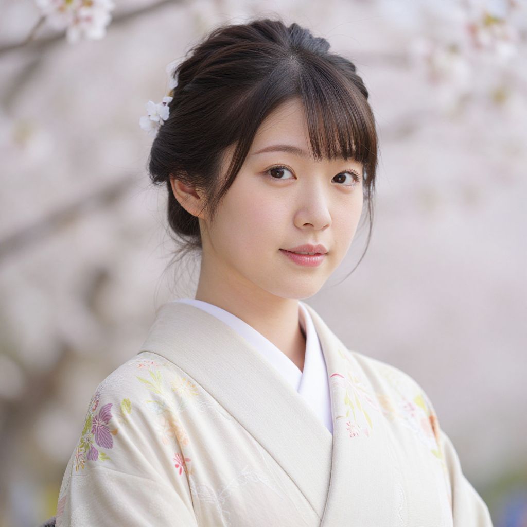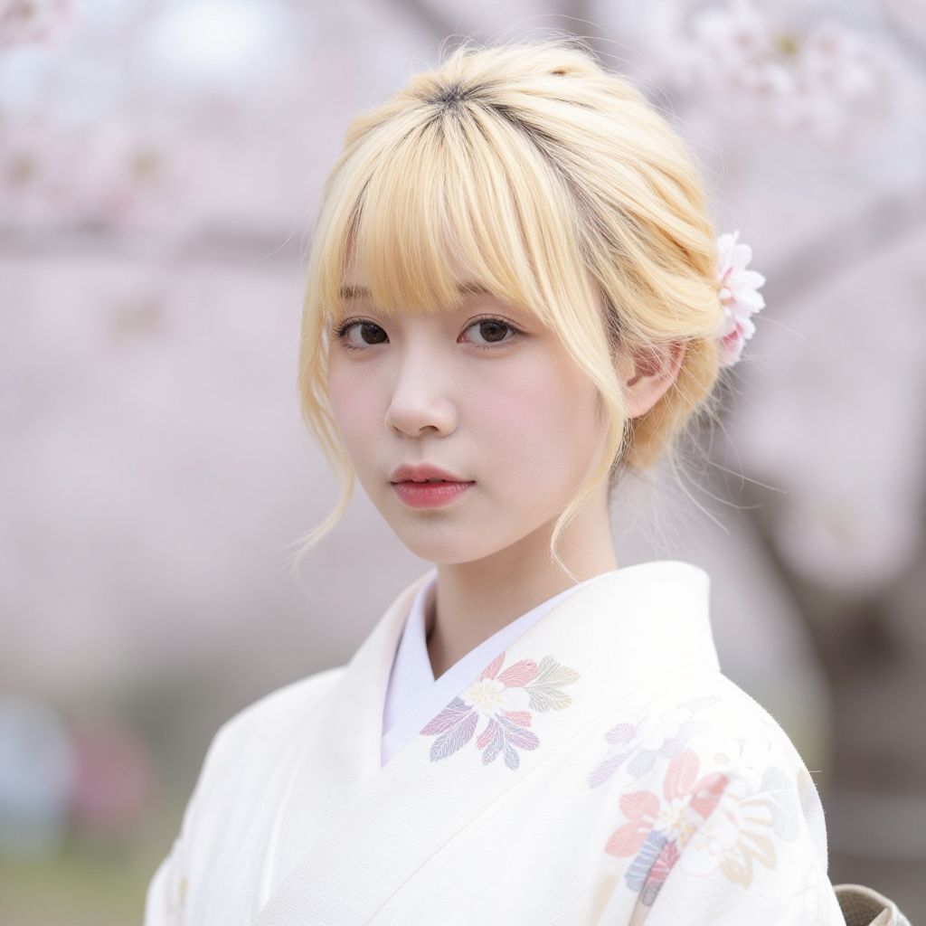 Photograph of a young Asian woman in a blue floral kimono with yellow obi, adorned with white hairpins, standing outdoors, blurred background of