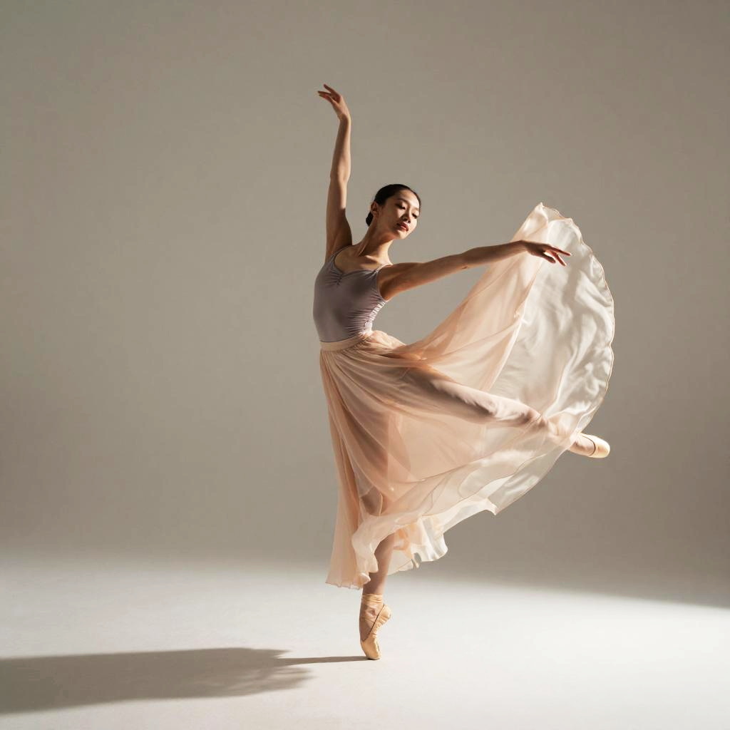 Lithe body of a graceful dancer mid-movement, flowing fabric, soft morning light, elegant pose, studio background, high detail, pastel colors, cinematic composition