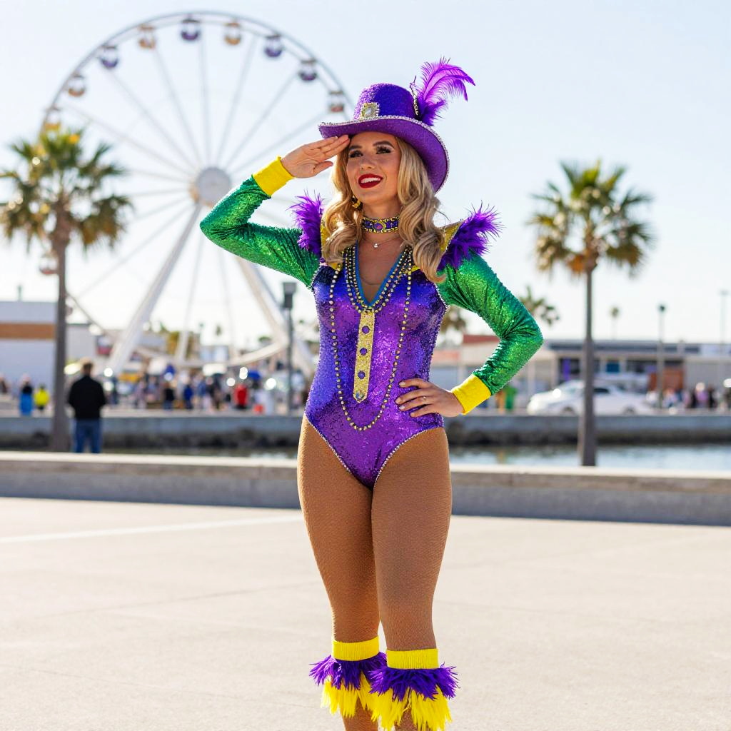 Photograph of a vibrant, female Mardi Gras performer standing outdoors. She's dressed in a colorful, glittery costume with a purple and green bodysuit, purple hat with purple feathers, and yellow and purple leg warmers. She has blonde hair, red lipstick, and is saluting with her right hand. The background shows a blurred Ferris wheel, palm trees, and a waterfront. The image has a slightly exaggerated, bright, and colorful style.