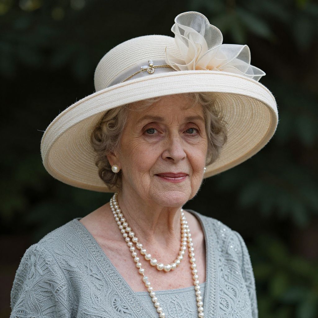 Photograph of an elderly woman with fair skin and short, wavy gray hair, wearing a large, white, wide-brimmed hat adorned with a large, cream-colored flower. She has blue eyes and is smiling gently. She is dressed in a light blue, lace-trimmed blouse and a double-strand pearl necklace. She also wears pearl earrings. The background is dark and out of focus, highlighting her as the subject. The image has a soft, natural light, emphasizing her gentle expression and elegant attire. The overall style is classic and refined.