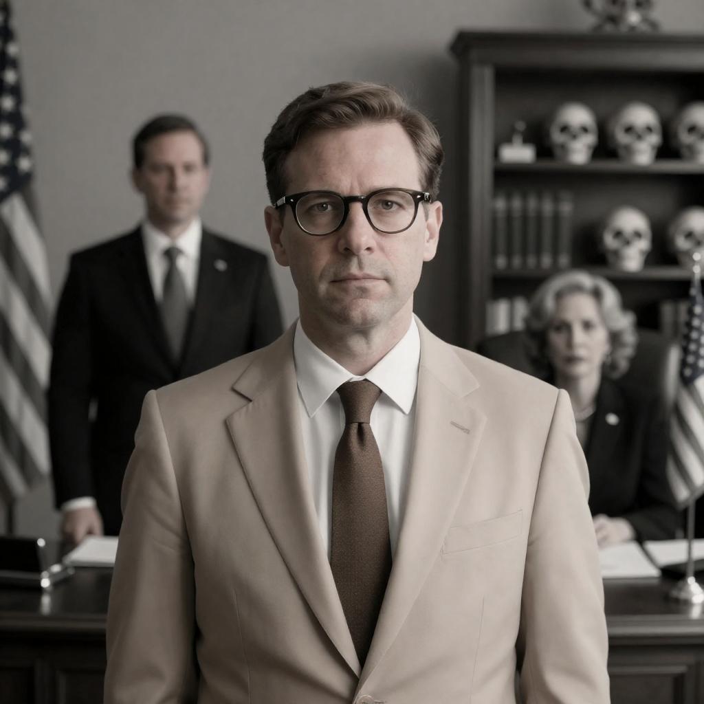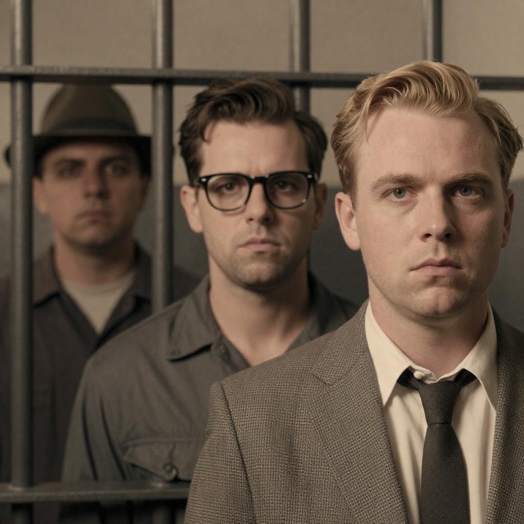 Photograph of three men in a prison cell. Foreground man, blond, serious expression, wearing checkered suit and tie, right side. Middle man, dark hair, glasses, intense look, slightly behind. Background man, hat, serious expression, left side, behind bars. Warm, sepia-toned lighting.
