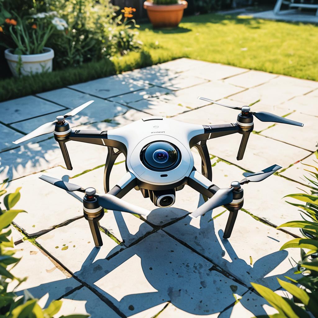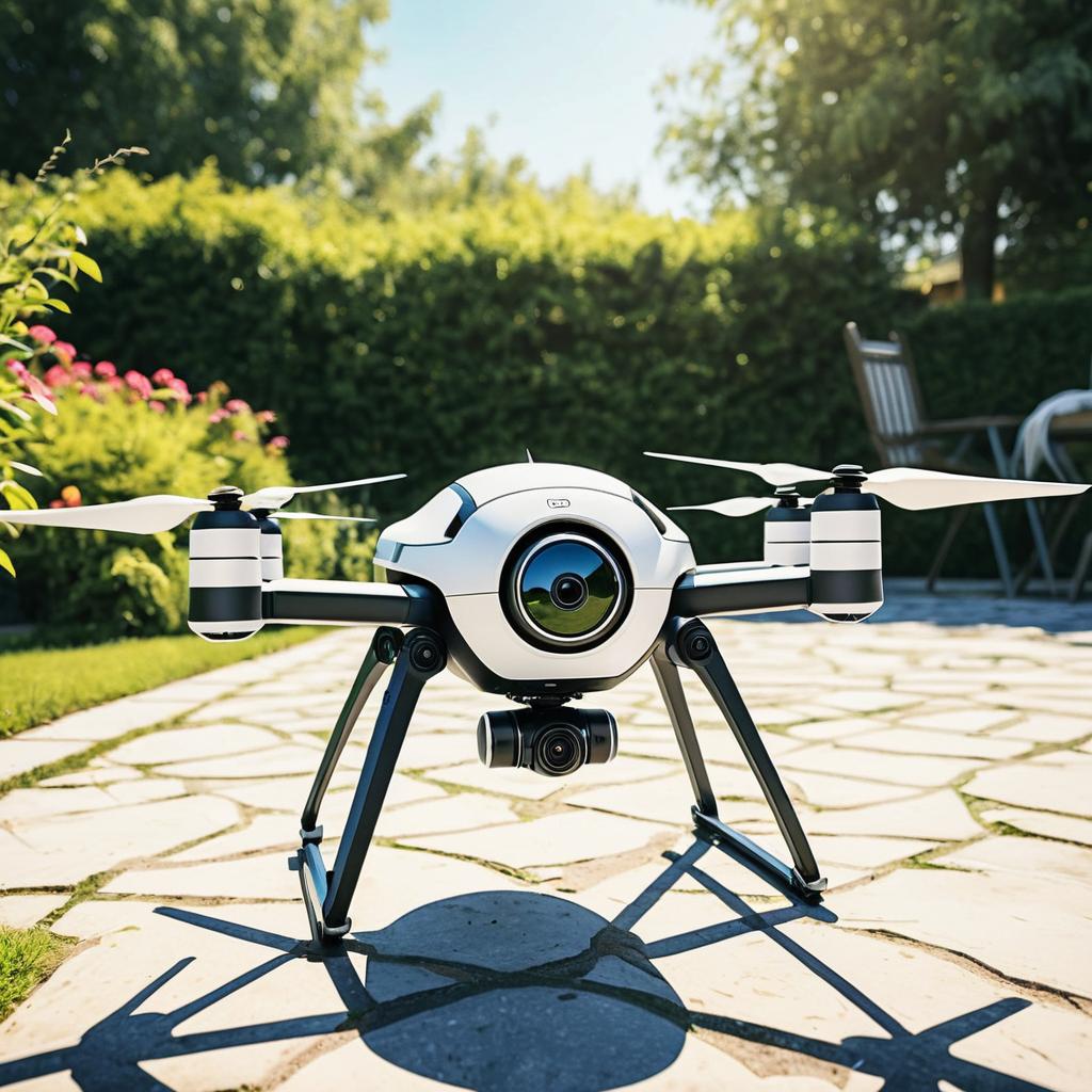 Close-up of a sleek white and black quadcopter drone with dual cameras placed on a sunny garden patio. The background features green grass, trees, white outdoor furniture, and a modern house structure, emphasizing a residential outdoor setting.